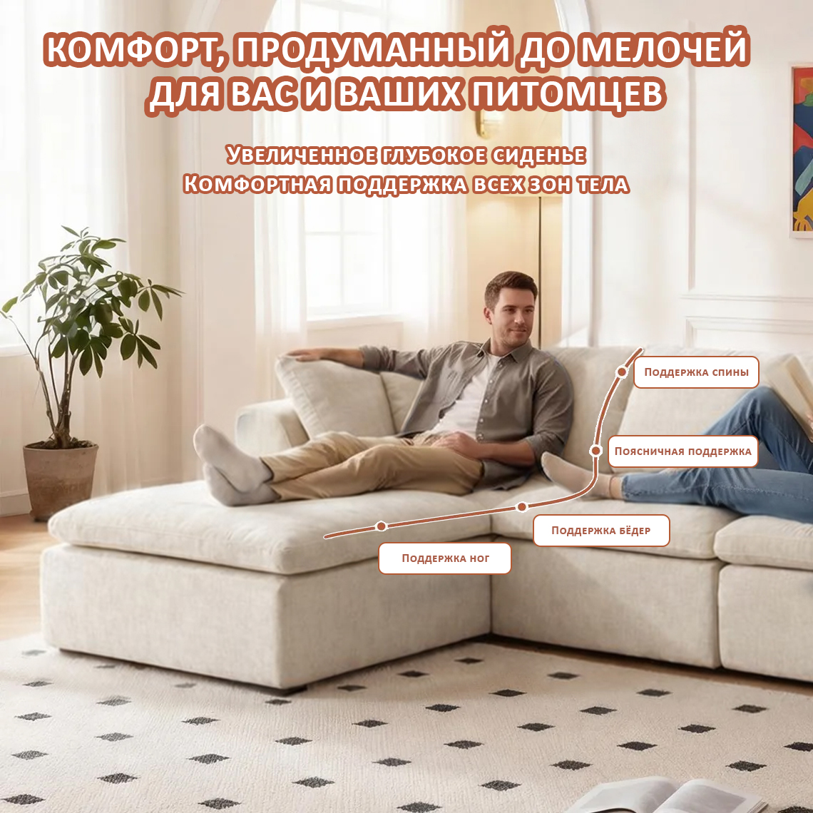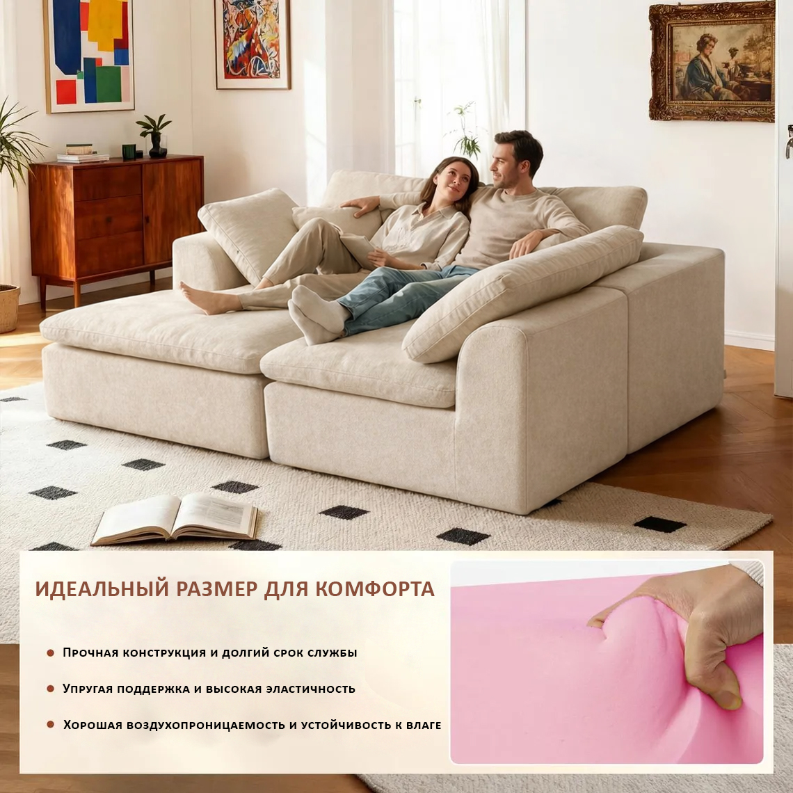 ☁️ Технология «Умной пены»: Комфорт бизнес-класса Забудьте о проваливающихся подушках и скрипе пружин. В основе дивана — моноблок из высокоэластичного пенополиуретана (ППУ) высокой плотности 40 кг/м³.