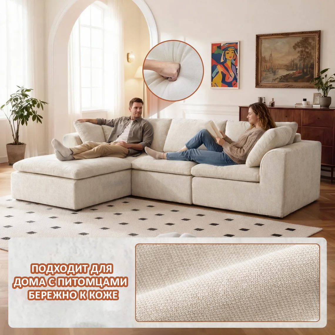 🐾 Премиальный Шенилл (450 г/м²) Обивка выполнена из плотного, износостойкого шенилла. Ткань обладает нежной бархатистой фактурой, «дышит» и легко чистится. Благодаря высокой плотности плетения, она устойчива к зацепкам и коготкам домашних животных (антивандальные свойства).