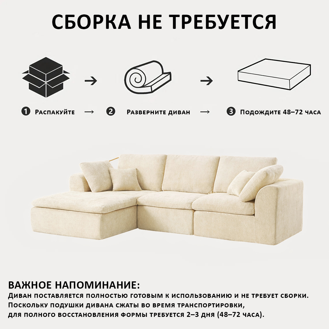 Сборка: Вам не нужны инструменты. Просто вскройте вакуумную упаковку — и за 24–72 часа диван наберет воздух и примет идеальную форму.