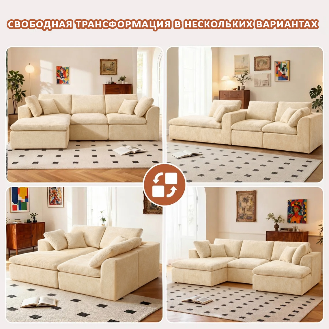 🧩 Модульный конструктор 4-в-1 Меняйте интерьер под настроение! Независимые модули позволяют создать левый или правый угол, выстроить диван в одну длинную линию или собрать огромную квадратную кровать размером 178х185 см.
